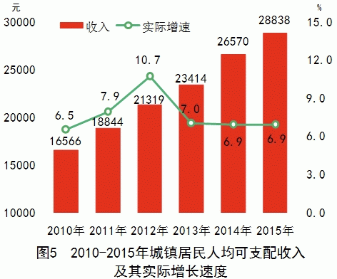 全省全體居民人均可支配收入19317元,比上年增長(cháng)9.6%,扣除價(jià)格因素實(shí)際增長(cháng)8.1%;人均可支配收入中位數16654元。城鎮居民人均可支配收入28838元,比上年增長(cháng)8.5%,扣除價(jià)格因素實(shí)際增長(cháng)6.9%;城鎮居民人均可支配收入中位數27216元。農村居民人均可支配收入10993元,增長(cháng)9.3%,扣除價(jià)格因素實(shí)際增長(cháng)8.1%;農村居民人均可支配收入中位數10032元。分區域看,長(cháng)株潭地區居民人均可支配收入30655元,增長(cháng)8.4%;湘南地區18070元,增長(cháng)9.2%;大湘西地區12877元,增長(cháng)10.2%;洞庭湖地區17603元,增長(cháng)9.6%。城鄉居民收入比由上年的2.64:1縮小為2.62:1。