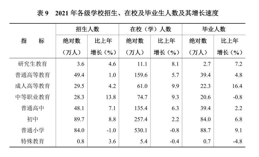 年末有普通高校114所。研究生教育畢業(yè)生2.7萬(wàn)人,普通高等教育畢業(yè)生39.4萬(wàn)人,中等職業(yè)教育畢業(yè)生20.6萬(wàn)人,普通高中畢業(yè)生39.4萬(wàn)人,初中畢業(yè)生84.0萬(wàn)人,普通小學(xué)畢業(yè)生88.7萬(wàn)人。在園幼兒229.4萬(wàn)人,比上年下降0.9%。小學(xué)適齡兒童入學(xué)率