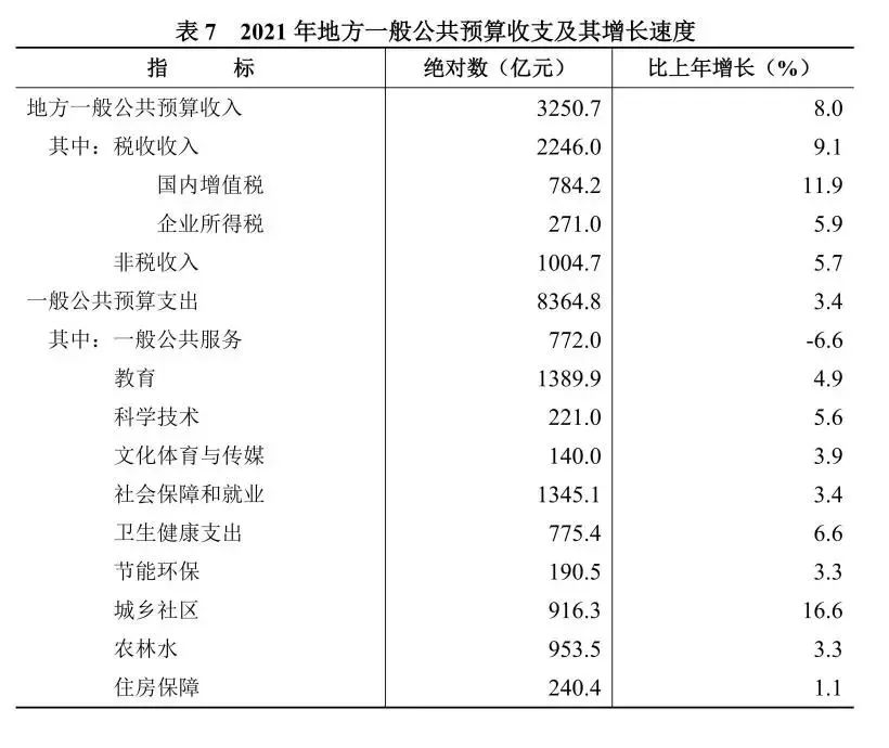 全年地方一般公共預算收入3250.7億元,比上年增長(cháng)8.0%。其中,稅收收入2246.0億元,增長(cháng)9.1%;非稅收入1004.7億元,增長(cháng)5.7%。稅收收入中,國內增值稅784.2億元,增長(cháng)11.9%;企業(yè)所得稅271.0億元,增長(cháng)5.9%。一般公共預算支出8364.8億元,增長(cháng)3.4%。其中,教育支出1389.9億元,增長(cháng)4.9%;社會(huì )保障和就業(yè)支出1345.1億元,增長(cháng)3.4%;衛生健康支出775.4億元,增長(cháng)6.6%;科學(xué)技術(shù)支出221.0億元,增長(cháng)5.6%;住房保障支出240.4億元,增長(cháng)1.1%。