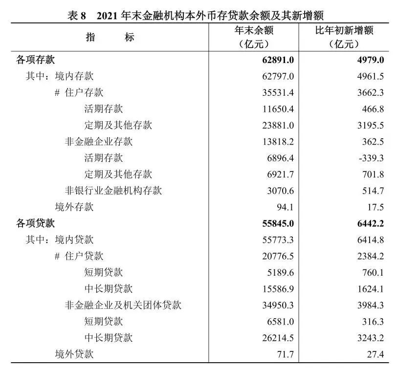 年末金融機構本外幣各項存款余額62891.0億元,比上年末增長(cháng)8.6%。其中,住戶(hù)存款余額35531.4億元,增長(cháng)11.5%;非金融企業(yè)存款余額13818.2億元,增長(cháng)2.7%。本外幣各項貸款余額55845.0億元,增長(cháng)13.0%。其中,住戶(hù)貸款余額20776.5億元,增長(cháng)13.0%;非金融企業(yè)及機關(guān)團體貸款余額34950.3億元,增長(cháng)12.9%。