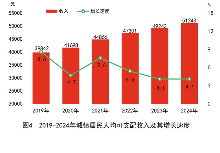 全年全省居民人均可支配收入37679元,比上年增長(cháng)5.0%;居民人均可支配收入中位數[28]30000元,增長(cháng)4.9%。按常住地分,城鎮居民人均可支配收入51243元,增長(cháng)4.1%;城鎮居民人均可支配收入中位數45524元,增長(cháng)4.2%。農村居民人均可支配收入22204元,增長(cháng)6.1%;農村居民人均可支配收入中位數19699元,增長(cháng)6.0%。城鄉居民收入比由上年的2.35縮小為2.31。分區域看,長(cháng)株潭地區全體居民人均可支配收入56350元,增長(cháng)4.2%;湘南地區全體居民人均可支配收入34998元,增長(cháng)5.3%;大湘西地區全體居民人均可支配收入26402元,增長(cháng)5.6%;洞庭湖地區全體居民人均可支配收入35330元,增長(cháng)4.8%。脫貧縣[29]農村居民人均可支配收入17111元,增長(cháng)6.7%。
