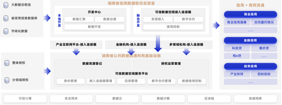 聯(lián)合實(shí)驗室將開(kāi)發(fā)形成的數據產(chǎn)品和服務(wù)上架至湖南省公共數據流通利用基礎設施,供各數據需求方靈活調用,如“湘信貸”平臺、商貿流通平臺及其他各類(lèi)產(chǎn)業(yè)互聯(lián)網(wǎng)平臺,充分釋放信用數據價(jià)值。