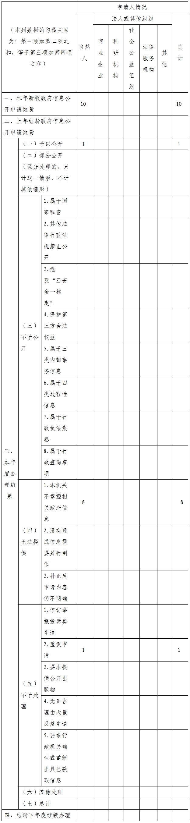 2019年,我局收到10人次自然人申請政府信息公開(kāi)事項,都給予了書(shū)面答復或電話(huà)溝通,引導和建議申請者向相關(guān)部門(mén)咨詢(xún),其中1次為同一事項經(jīng)回復后重復申請,依申請公開(kāi)件按時(shí)辦結率100%。(詳見(jiàn)第二部分《主動(dòng)公開(kāi)政府信息情況》表格)